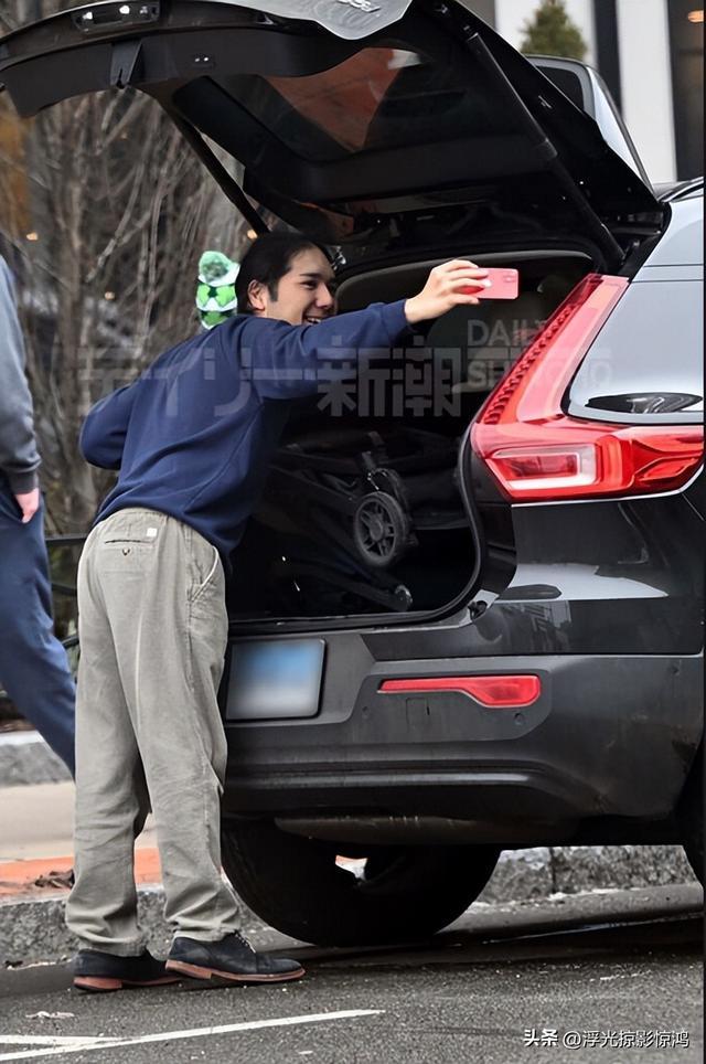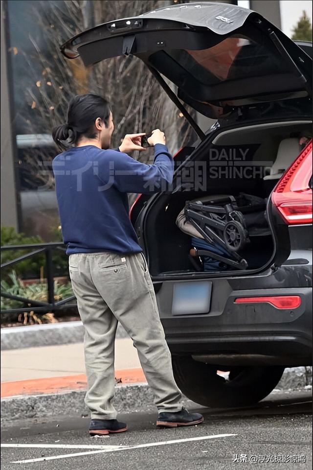 小室圭把孩子放在儿童座椅上放好,站在车外等候妻子。
